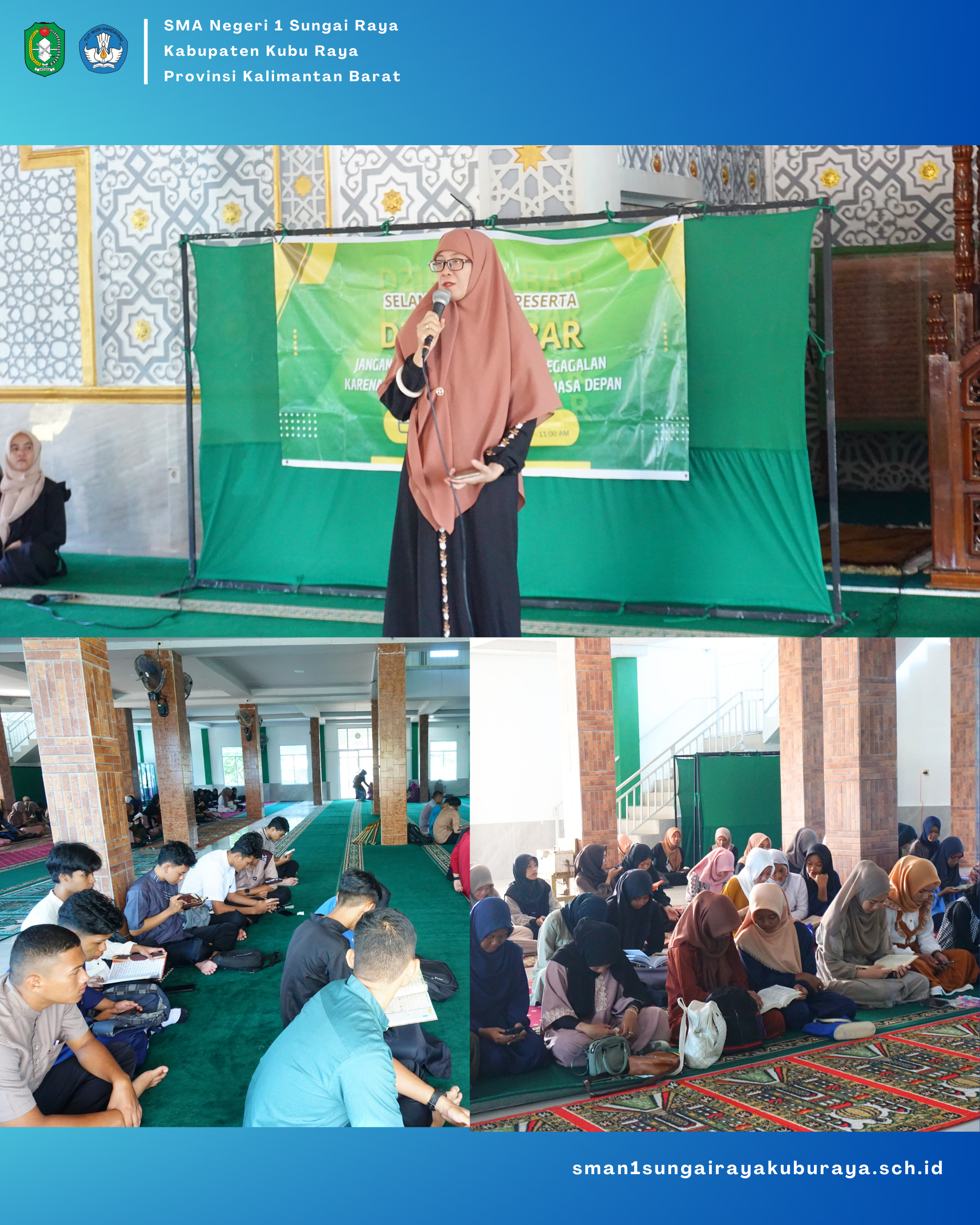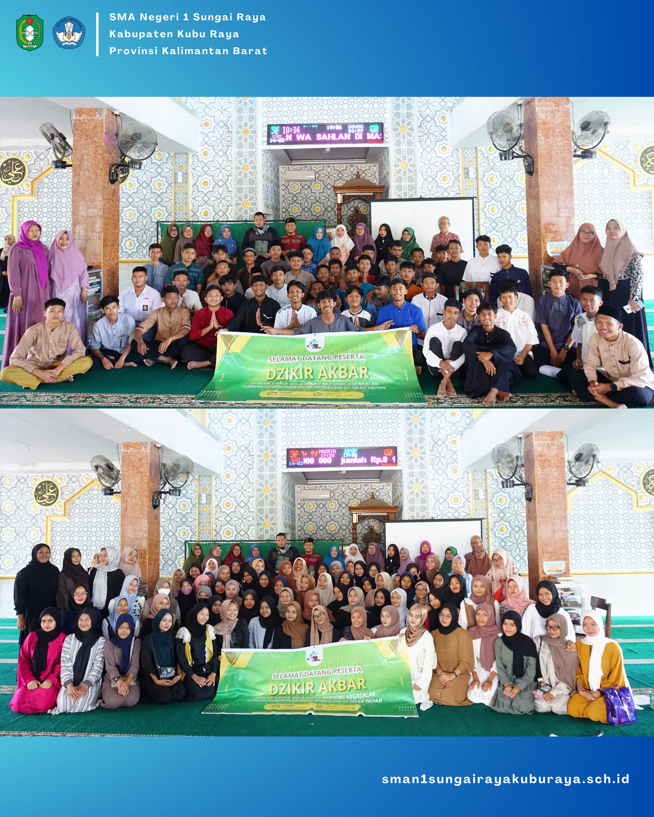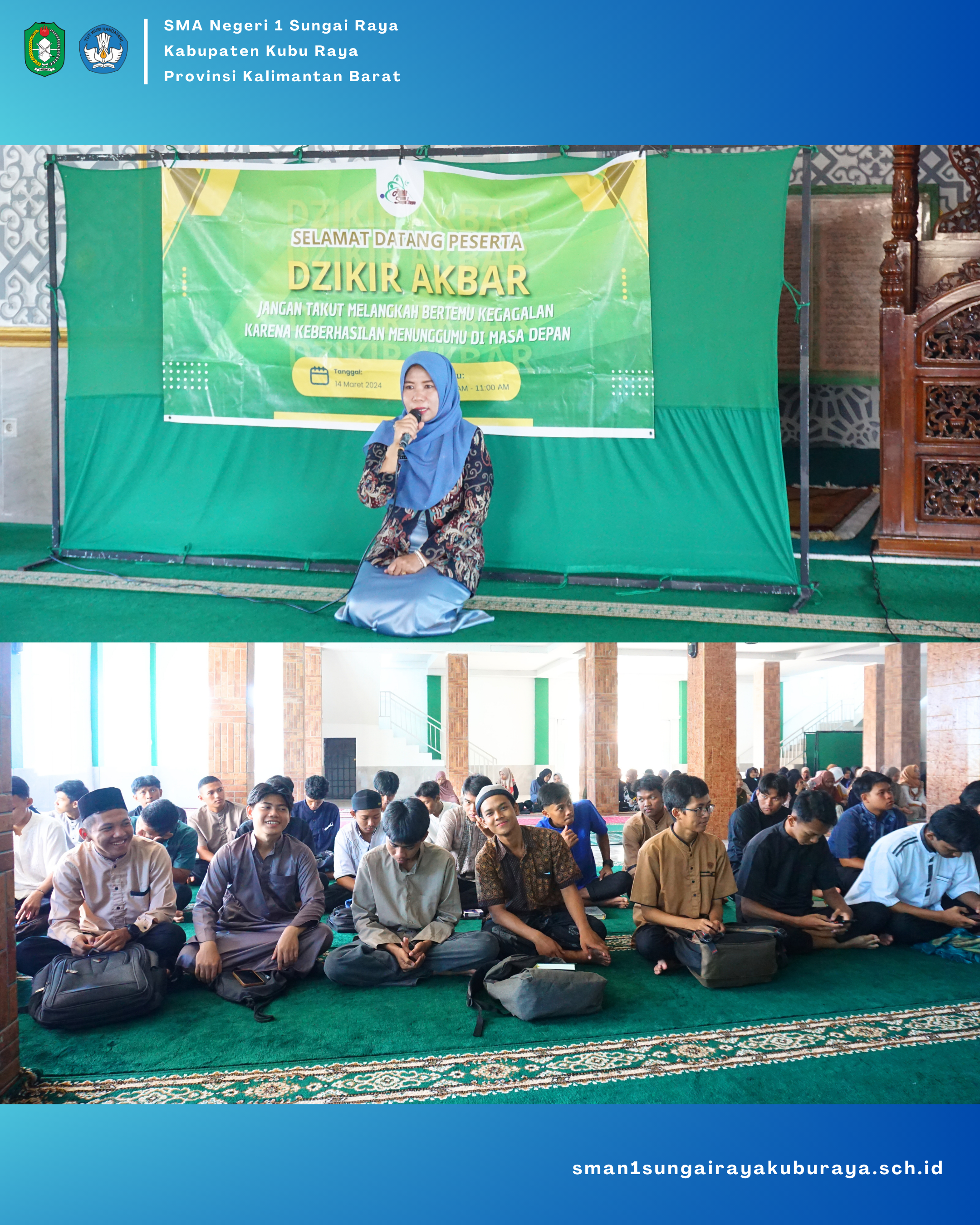 Kegiatan Dzikir Akbar dalam Rangka Persiapan Ujuan Sumatif 2023/2024 bagi siswa/siswi Muslim Kelas XII MIA/IS SMAN 1 Sungai Raya Di Masjid Mujahid Pejuang pada hari ini Kamis 14 Maret 2024. Kegiatan Dzikir Akbar tahun ini bertemakan "Jangan Takut Melangkah Bertemu Kegagalab Karena Keberhasilan Menunggumu di Masa Depan", Dzikir Akbar ini diselenggarakan bersama pengurus Rohis Ruhul Jadid SMAN 1 Sungai Raya Kubu Raya @rohisruhuljadid yang dihadiri oleh Seluruh Siswa/Siswi Kelas XII MIA/IIS serta Wali Kelas XII MIA/IIS SMAN 1 Sungai Raya Kubu Raya. Dilanjutkan dengan sambutan dari Ketua Panitia Dzikir Akbar, kemudian Kata Sambutan dari Ibu Aisyah, M.Pd selaku Kepala Sekolah dan Penyampaian Motivasi oleh Pak Renold Wijaya, SE (Motivator Kalbar) bersama dengan Ceramah dari Pak Muhammad Babul Yatama, S.Sos. Dilanjutkan dengan Foto Bersama Siswa/siswi beserta Dewan Guru dan Penceramah.