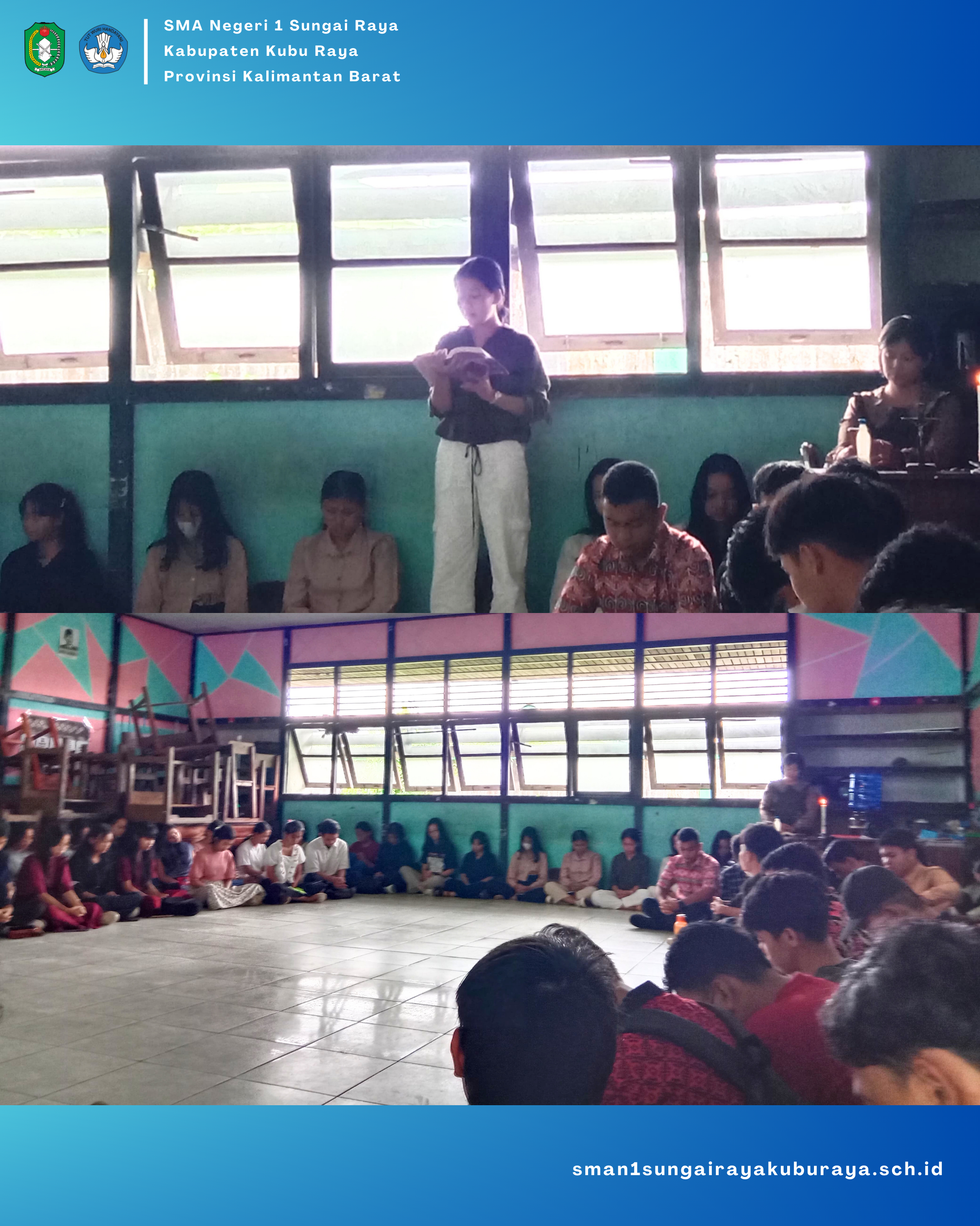Kegiatan Ibadat Satya bagi yang memeluk Agam Katolik diselenggarakan oleh Guru Pembina Agam Katolik Ibu Patrisia Sarianu, S.Ag di Ruang Kelas SMAN 1 Sungai Raya Kubu Raya dengan dihadiri oleh Seluruh Siswa/Siswi Agama Katolik SMAN 1 Sungai Raya Kubu Raya.
