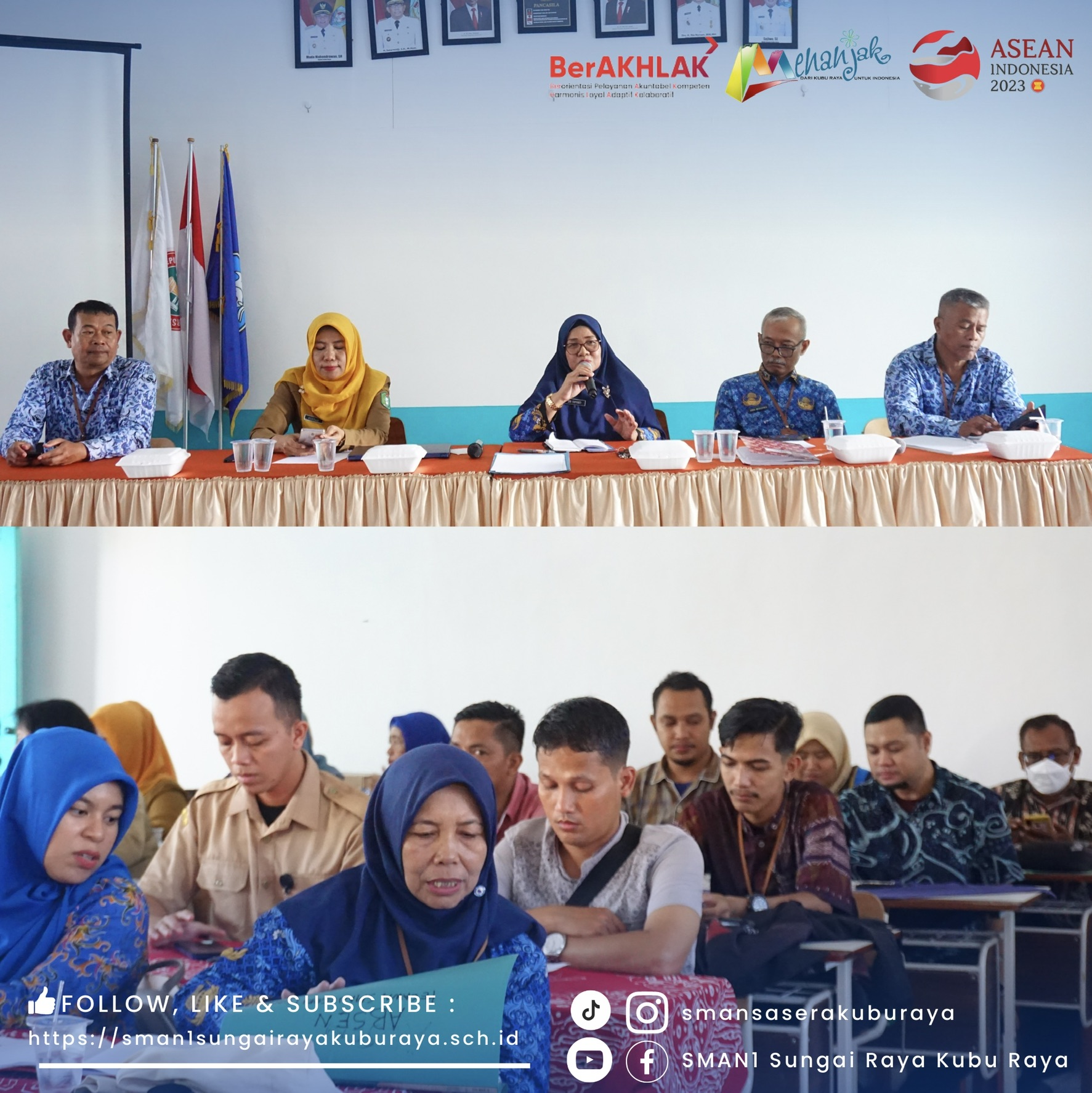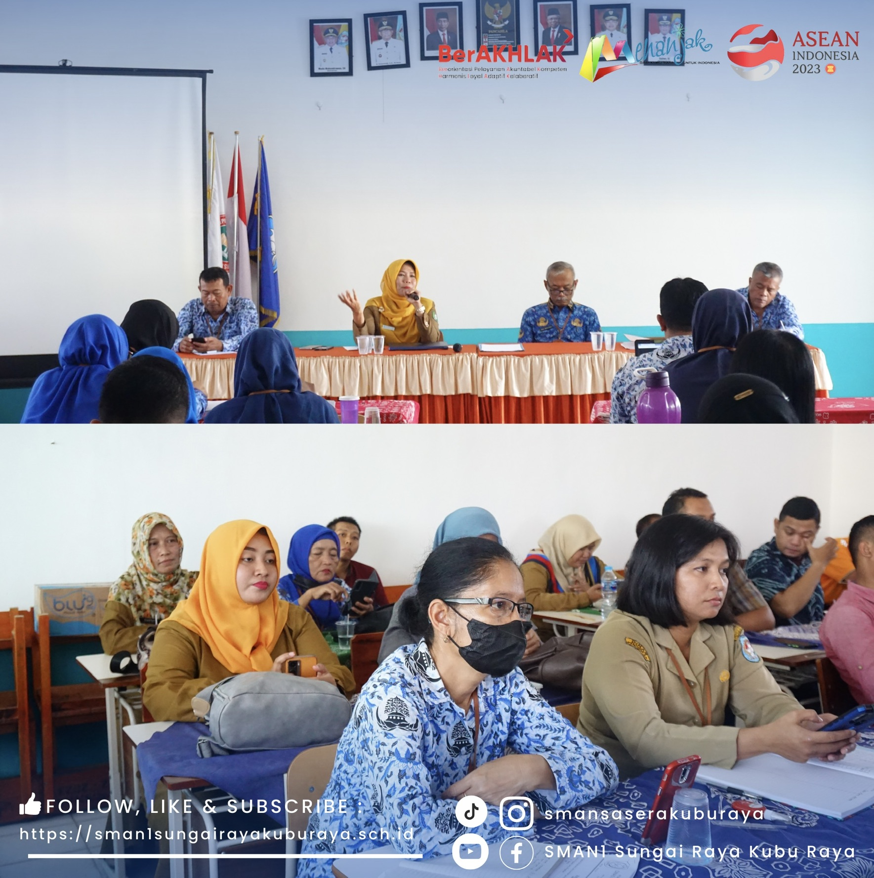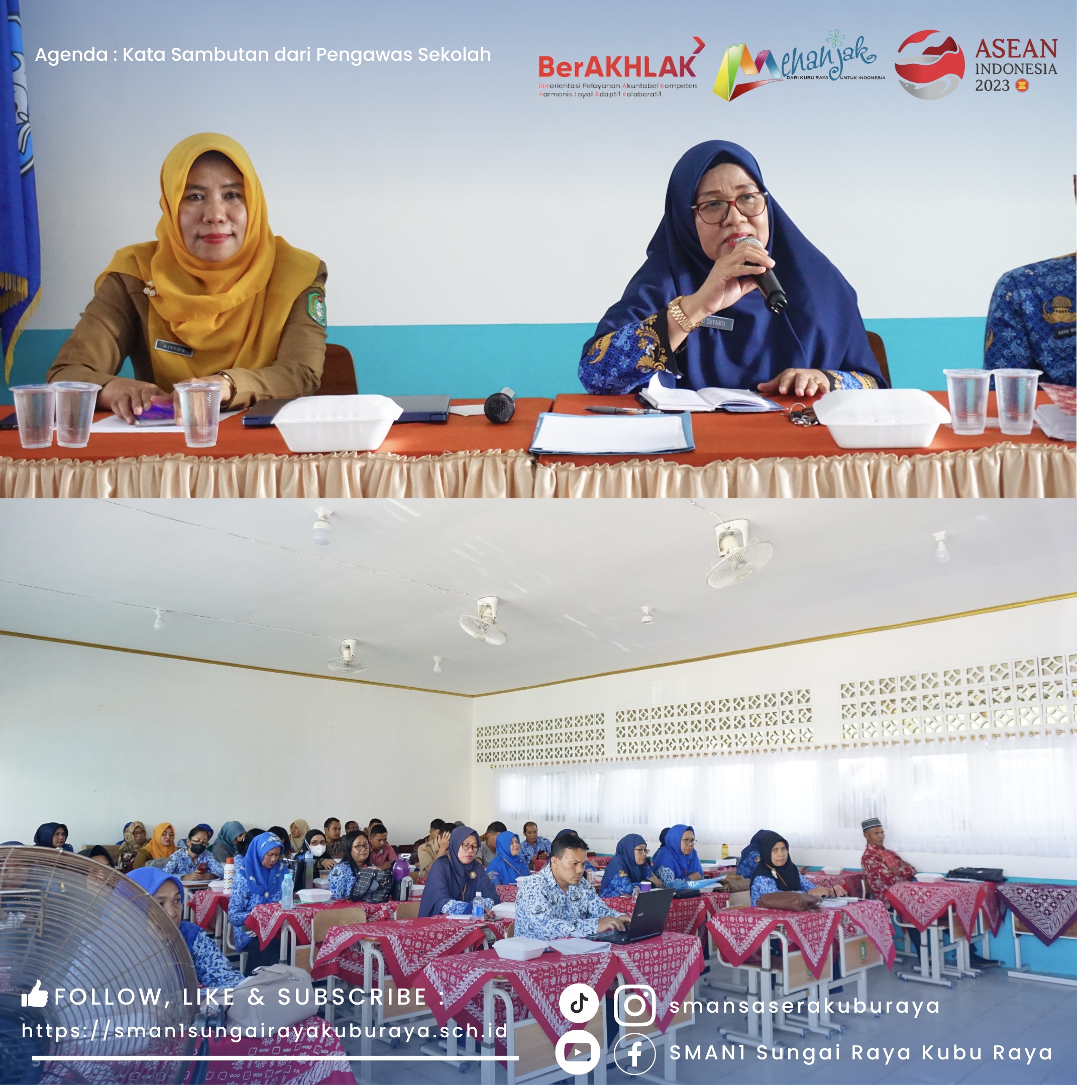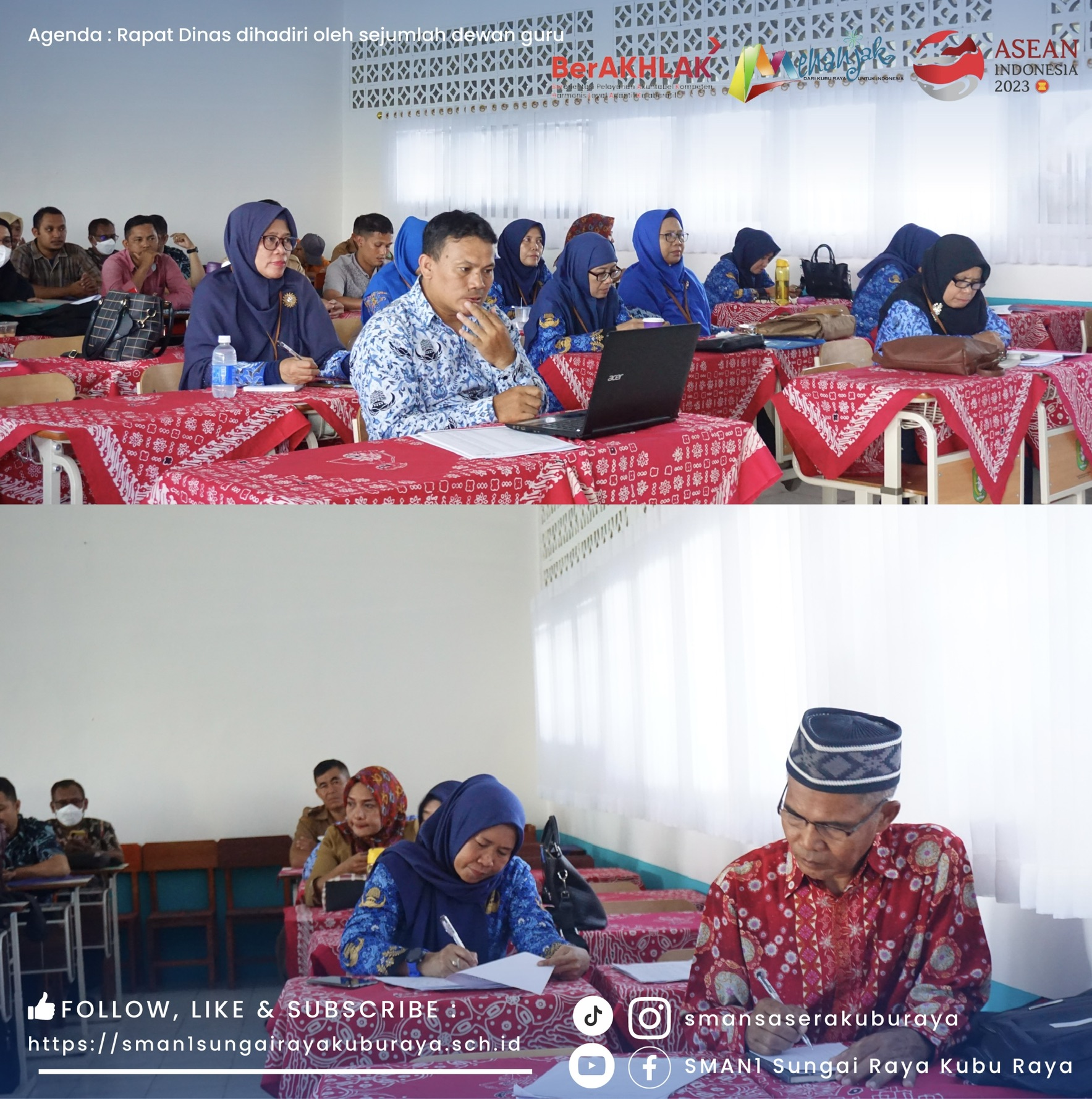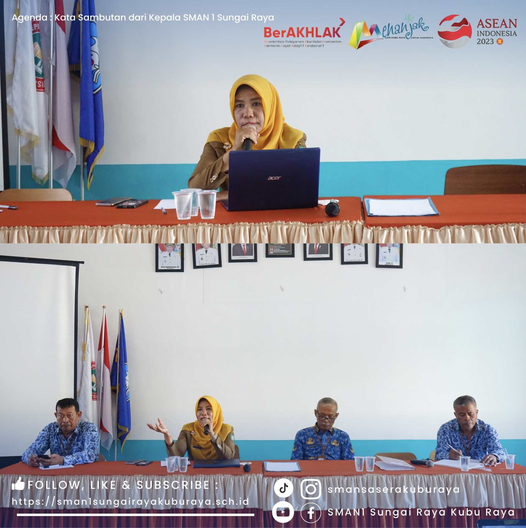 Agenda : Pembahasan dimulainya Tahun Ajaran Baru 2023/2024 dilaksanakan pada hari Senin, 17 Juli 2023 Pukul 10.15 - selesai. Rapat dipimpin oleh Kepala Sekolah , Aisyah M.Pd dan dihadiri oleh Pengawas Sekolah , Ibu Hj Sri Suyanti , S.Pd, M.Si. Peserta rapat yaitu Wakil Kepala Sekolah beserta Bapak/Ibu Dewan Guru, dan Staff Tata Usaha diselenggarakan di Ruang Aula Ki Hajar Dewantara SMA Negeri 1 Sungai Raya Kabupaten Kubu Raya.