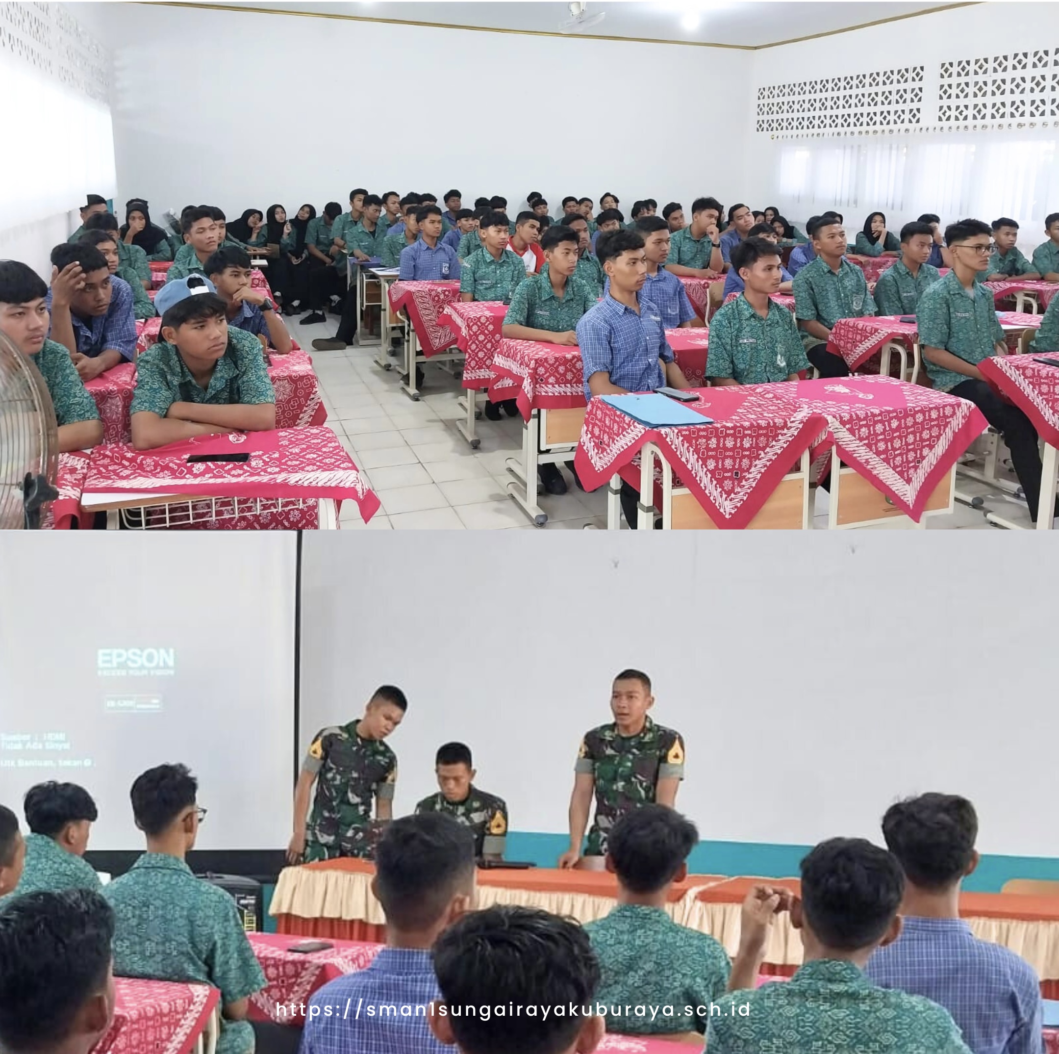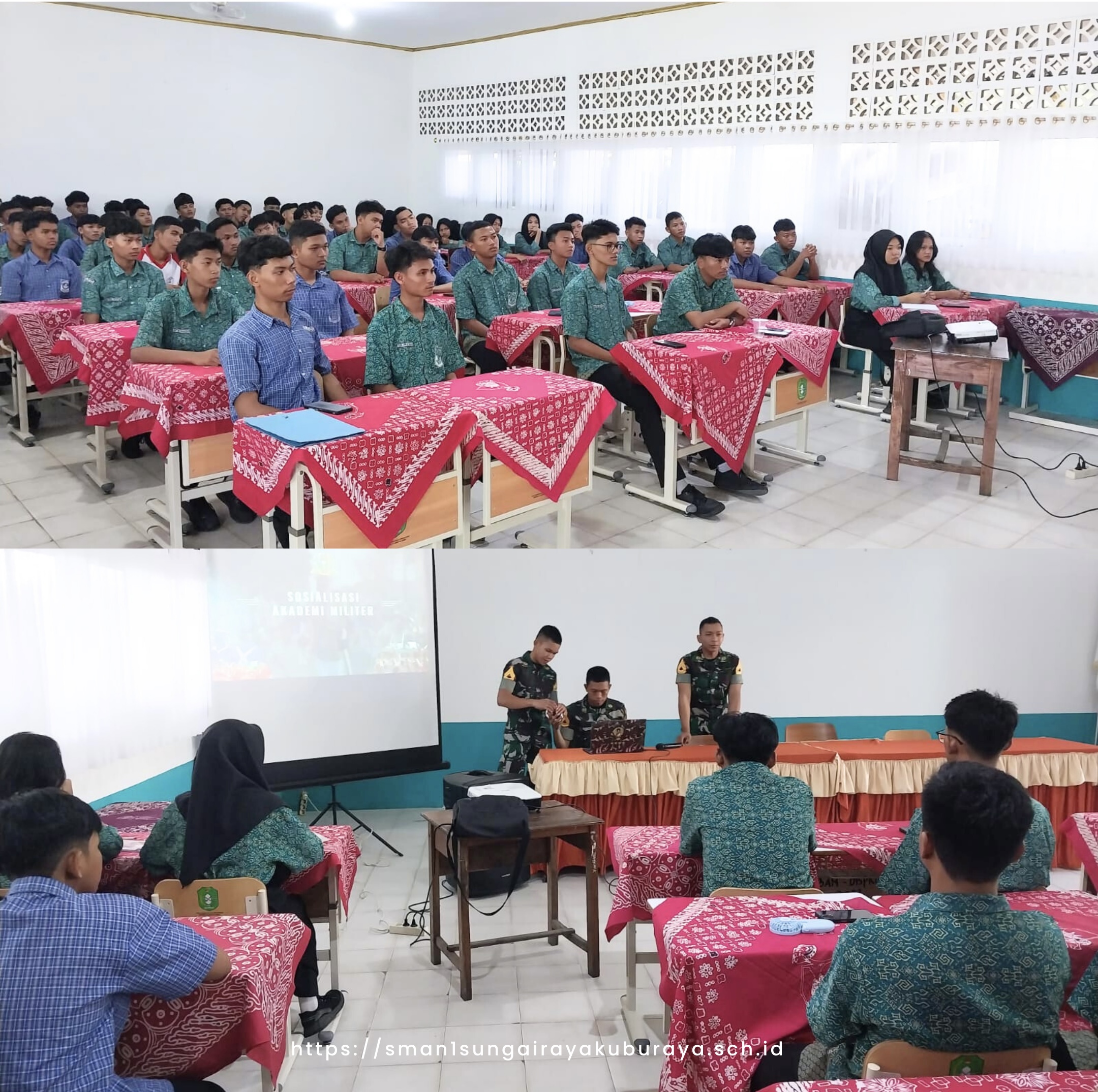 Sosialisasi yang dilakukan Akademi Militer dengan tema "Memberikan Sosialisasi dan Motivasi bagi para siswa/siswi SMAN 1 Sungai Raya yang mau mendaftar sebagai AKMIL" dibimbing oleh Langgeng Putra Wibawa Alumni SMAN 1 Sungai Raya Kubu Raya Angkatan 2020 serta rekan-rekan Akmil lainnya yang dilaksanakan pada Hari Selasa, 26 Juli 2023 pada pukul 08.00 sampai selesai di Aula Ki Hajar Dewantara SMA Negeri 1 Sungai Raya Kubu Raya
