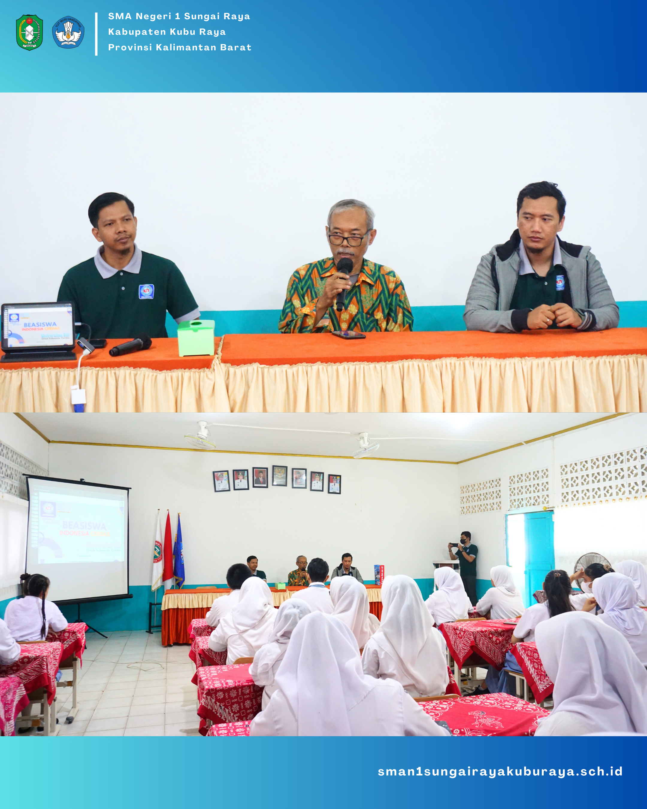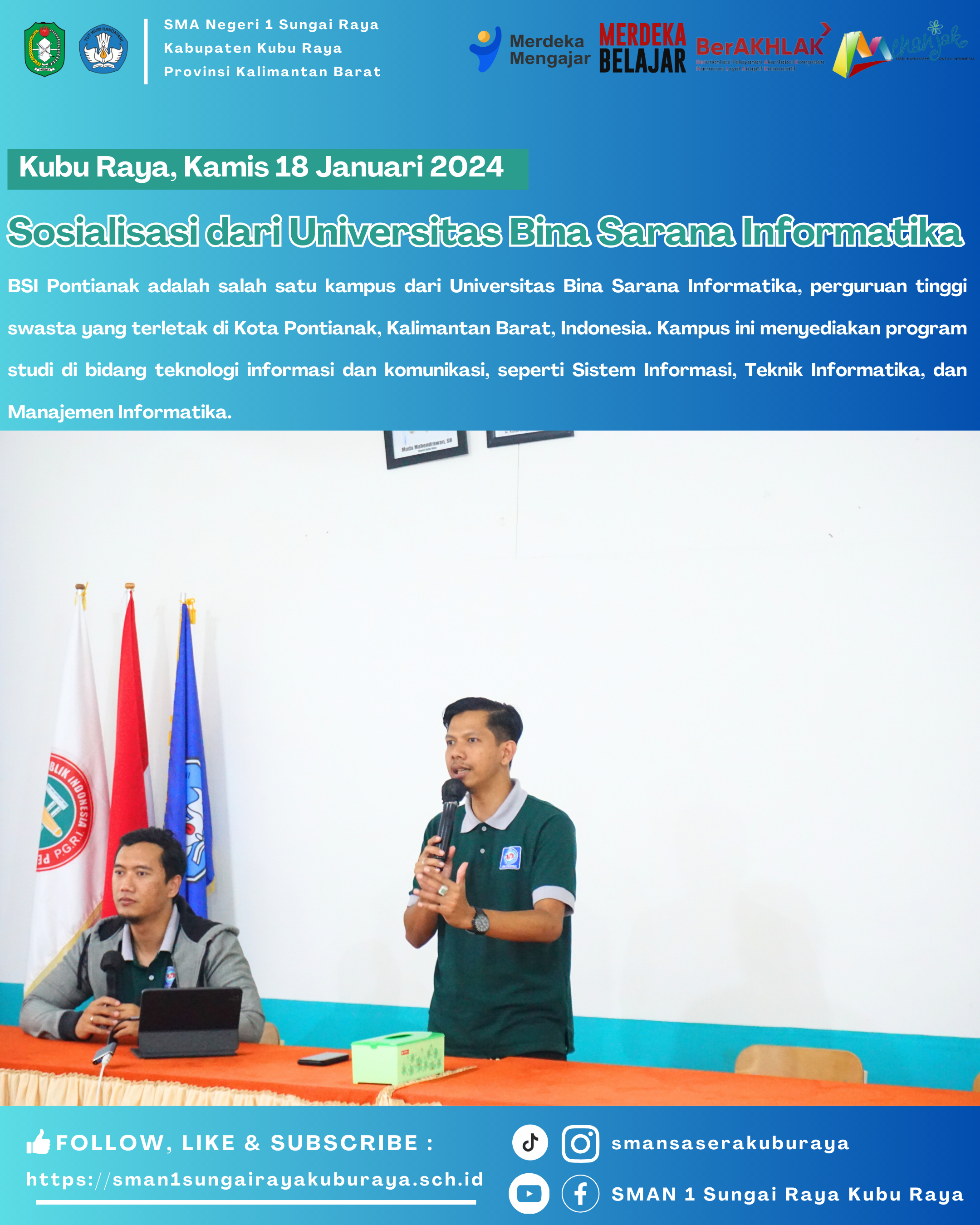 Sosialisasi yang dilakukan oleh Universitas "Bina Sarana Informatika Pontianak" bagi para siswa/siswi kelas XII MIA dan IIS SMAN 1 Sungai Raya dibimbing langsung oleh Perwakilan BSI Pontianak yang dilaksanakan pada Hari Kamis, 18 Januari 2024 pada pukul 10.20 - selesai di Aula Ki Hajar Dewantara SMA Negeri 1 Sungai Raya Kubu Raya.