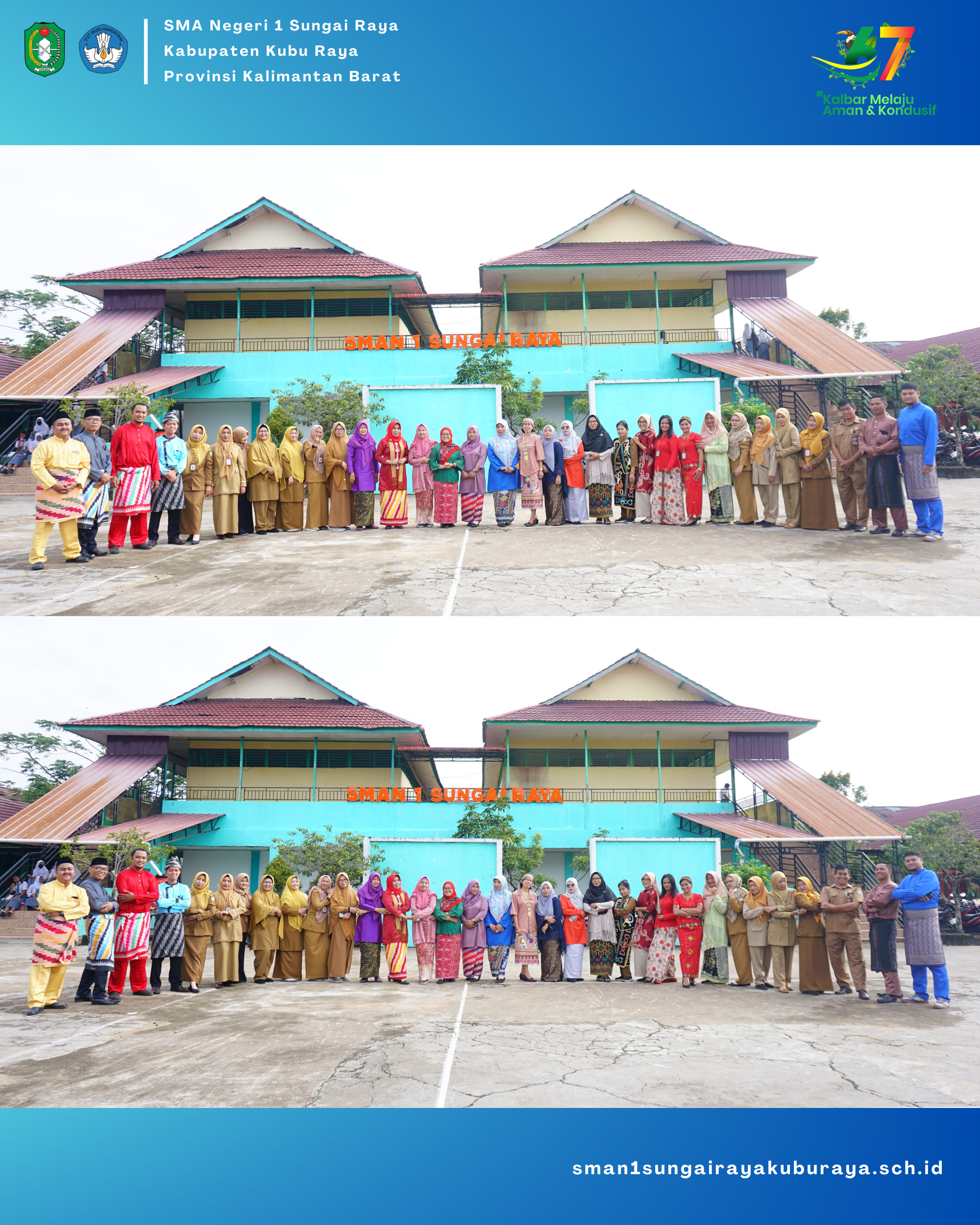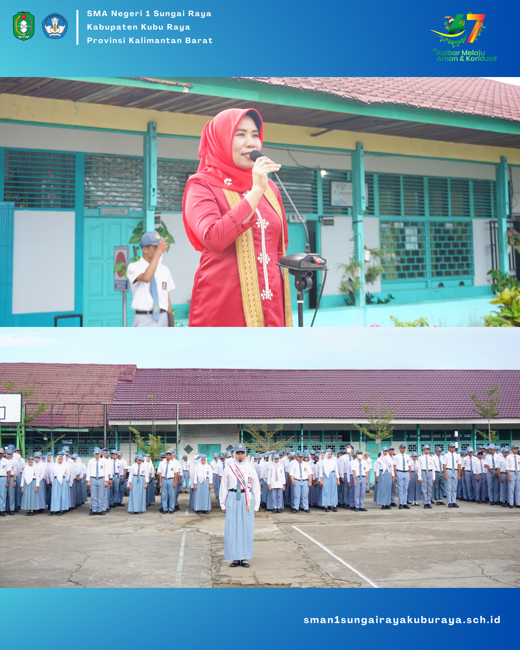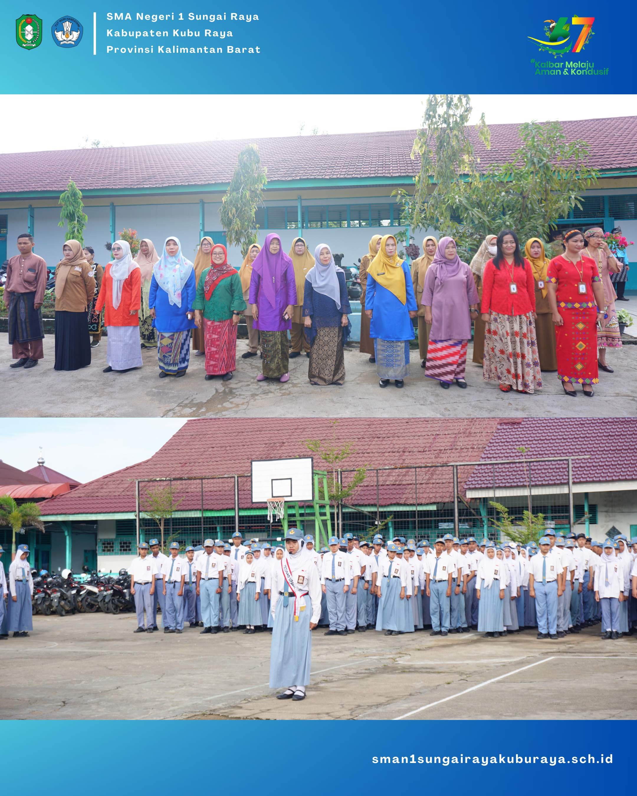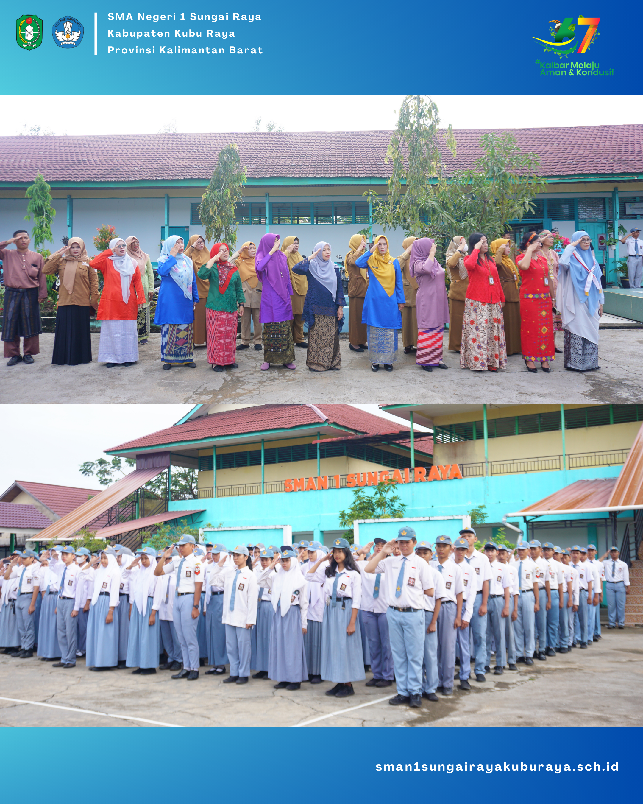 Upacara Bendera Hari Senin ini dalam Rangka Peringatan Hari Ulang Tahun (HUT) Ke-67 Pemerintah Provinsi Kalimantan Barat Tahun 2024 yang dipimpin langsung oleh Ibu Aisyah, M.Pd sebagai Kepala Sekolah SMAN 1 Sungai Raya dan dihadiri oleh Siswa/siswi serta Dewan Guru dan Staff SMAN 1 Sungai Raya dengan mengenalan Pakaian Adat Nasional sesuai Arahan Dinas Pendidikan Dan Kebudayaan Provinsi Kalimantan Barat.