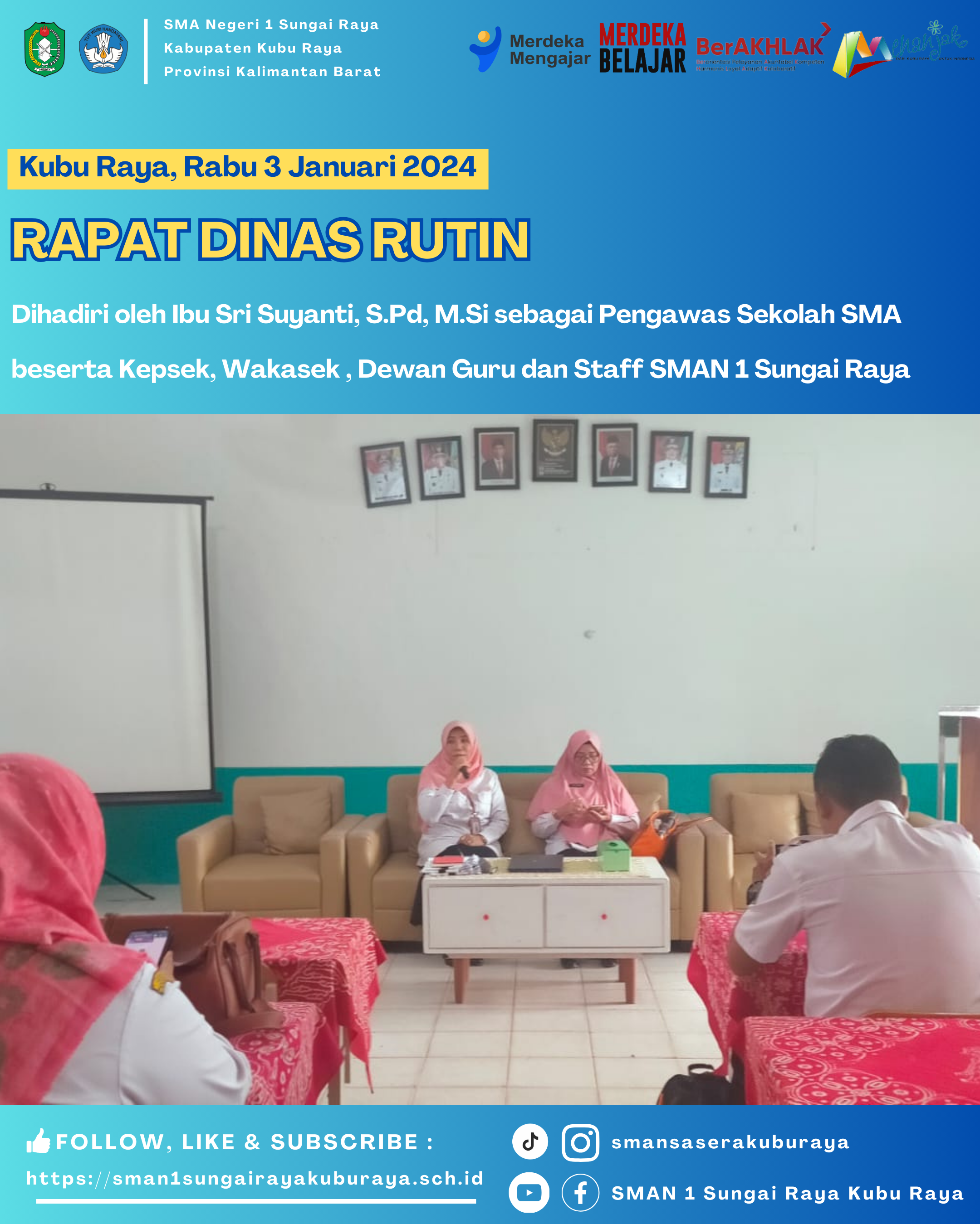 Kubu Raya, Rabu 3 Januari 2024 Agenda Rapat Dinas Rutin dengan Pembahasan Tentang: 1. Pengarahan dari Kepala Sekolah mengenai tambahan staff admin, ...
