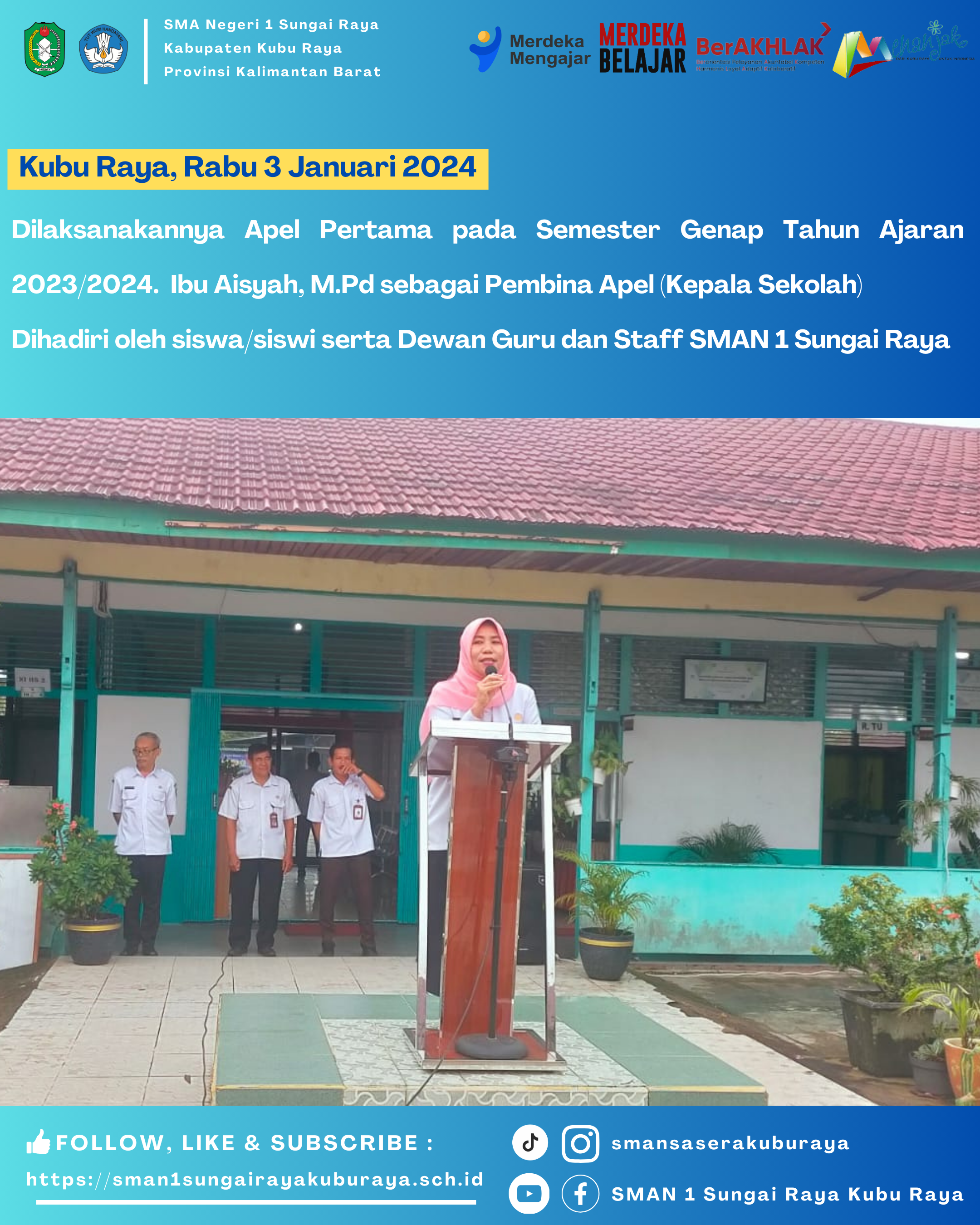 Kubu Raya, Rabu 3 Januari 2024 Pelaksanaan Apel Pertama pada Semester Genap Tahun Ajaran 2023/2024 Yang Dipimpin langsung oleh Ibu Aisyah, M.Pd sebag...