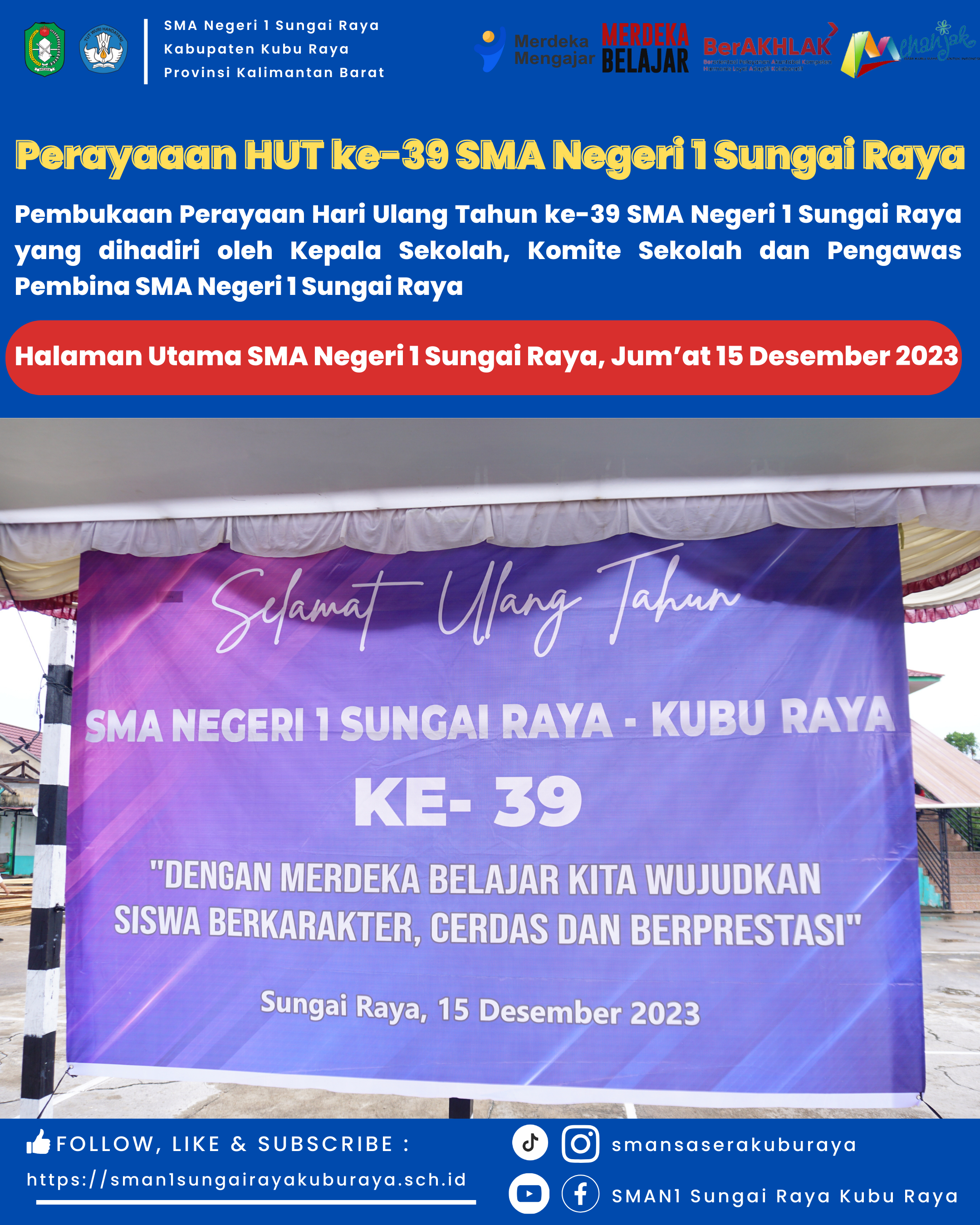 Kubu Raya, Jum'at 15 Desember 2023 Berkenaan dengan Pembukaan Acara Perayaan Hari Ulang Tahun ke-39 SMA Negeri 1 Sungai Raya Kab Kubu Raya yang disel...