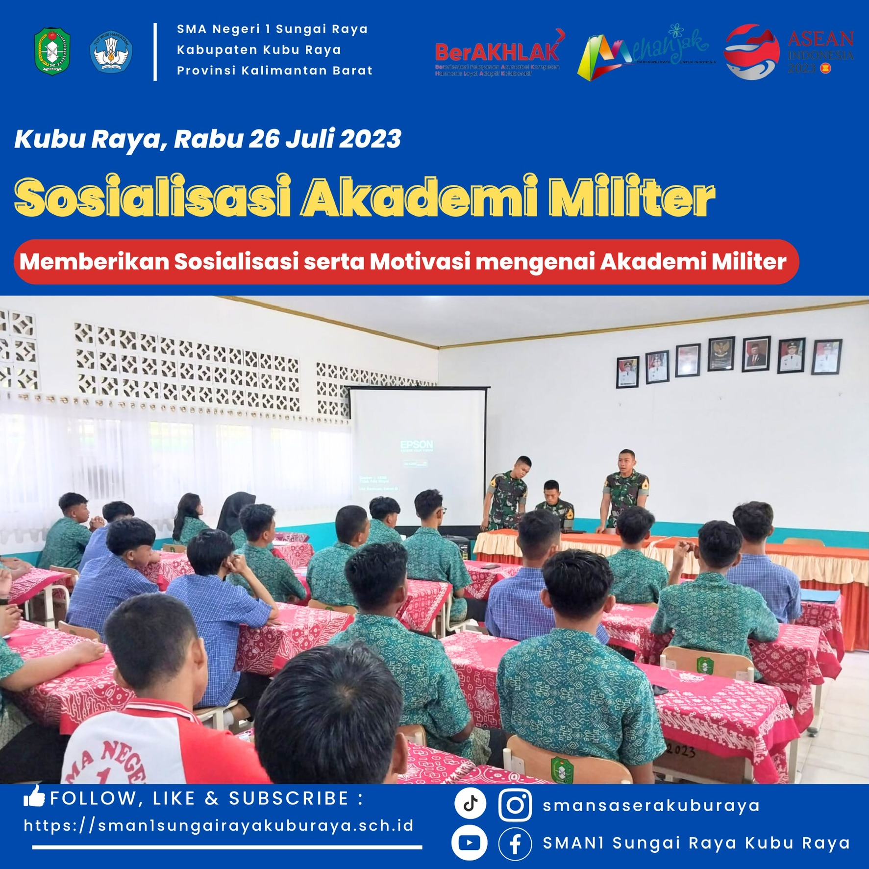 Sosialisasi yang dilakukan Akademi Militer dengan tema "Memberikan Sosialisasi dan Motivasi bagi para siswa/siswi SMAN 1 Sungai Raya yang mau mendaft...