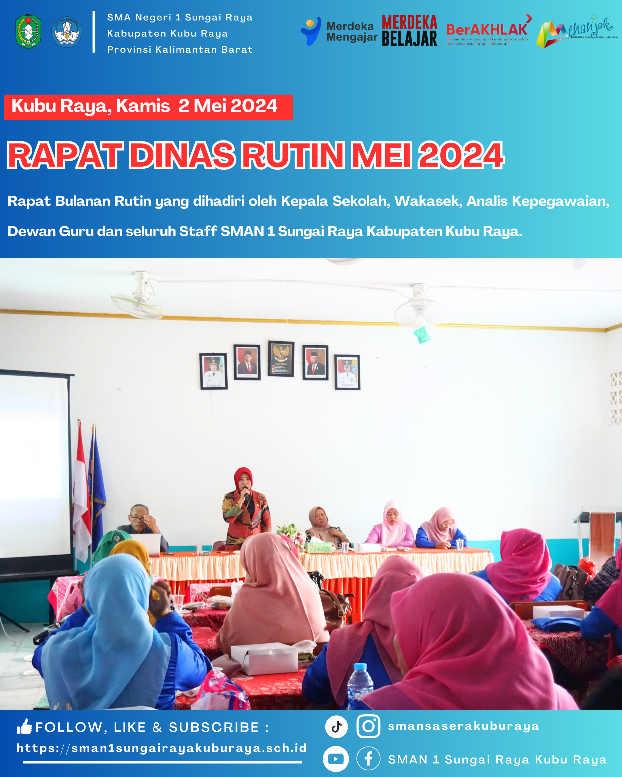 Kubu Raya, Kamis 2 Mei 2024 Kegiatan Rapat Dinas Rutin ini dilaksanakan pada hari Kamis, 2 Mei 2024 Pukul 11.30 - selesai yang dipimpin oleh Kepala S...