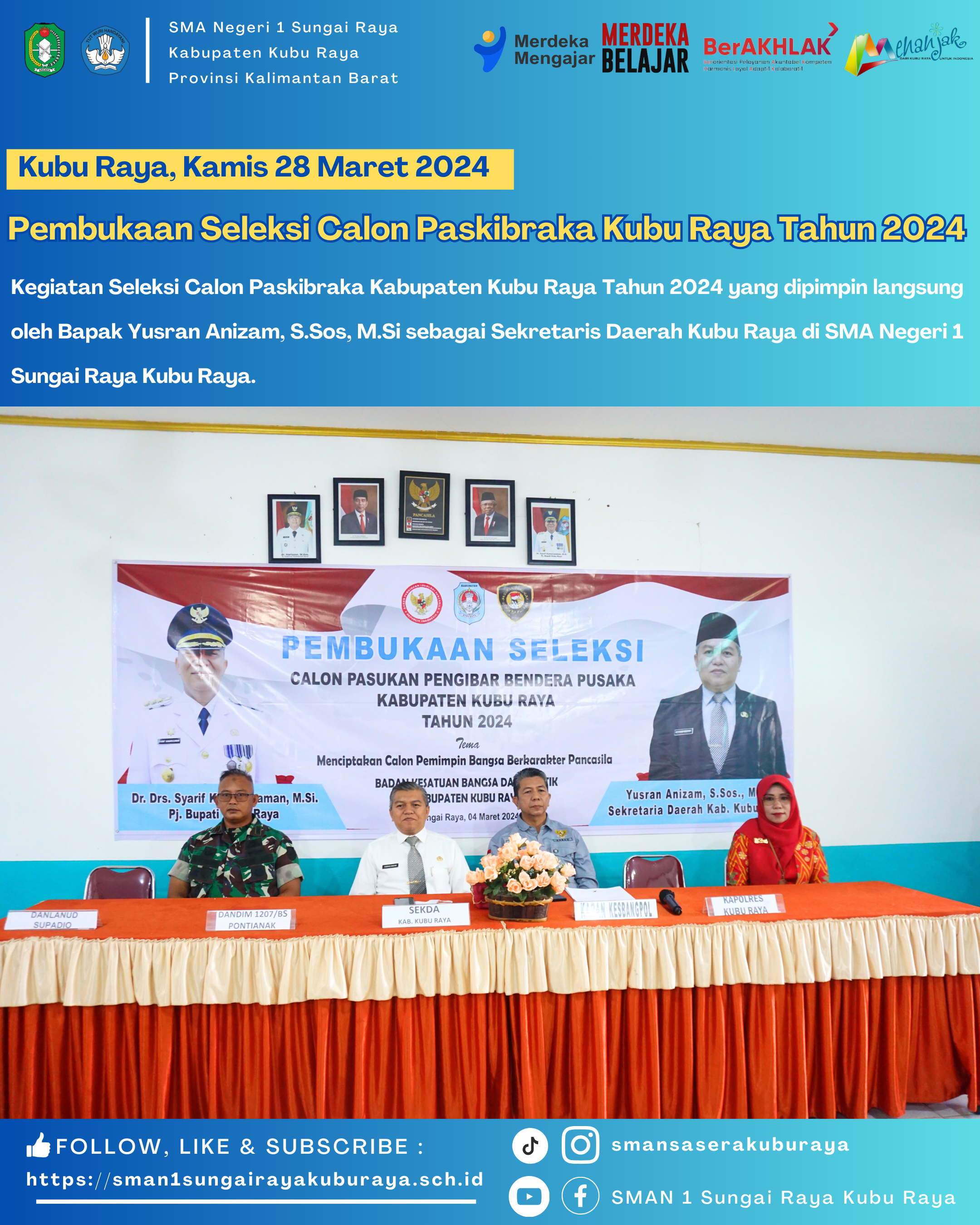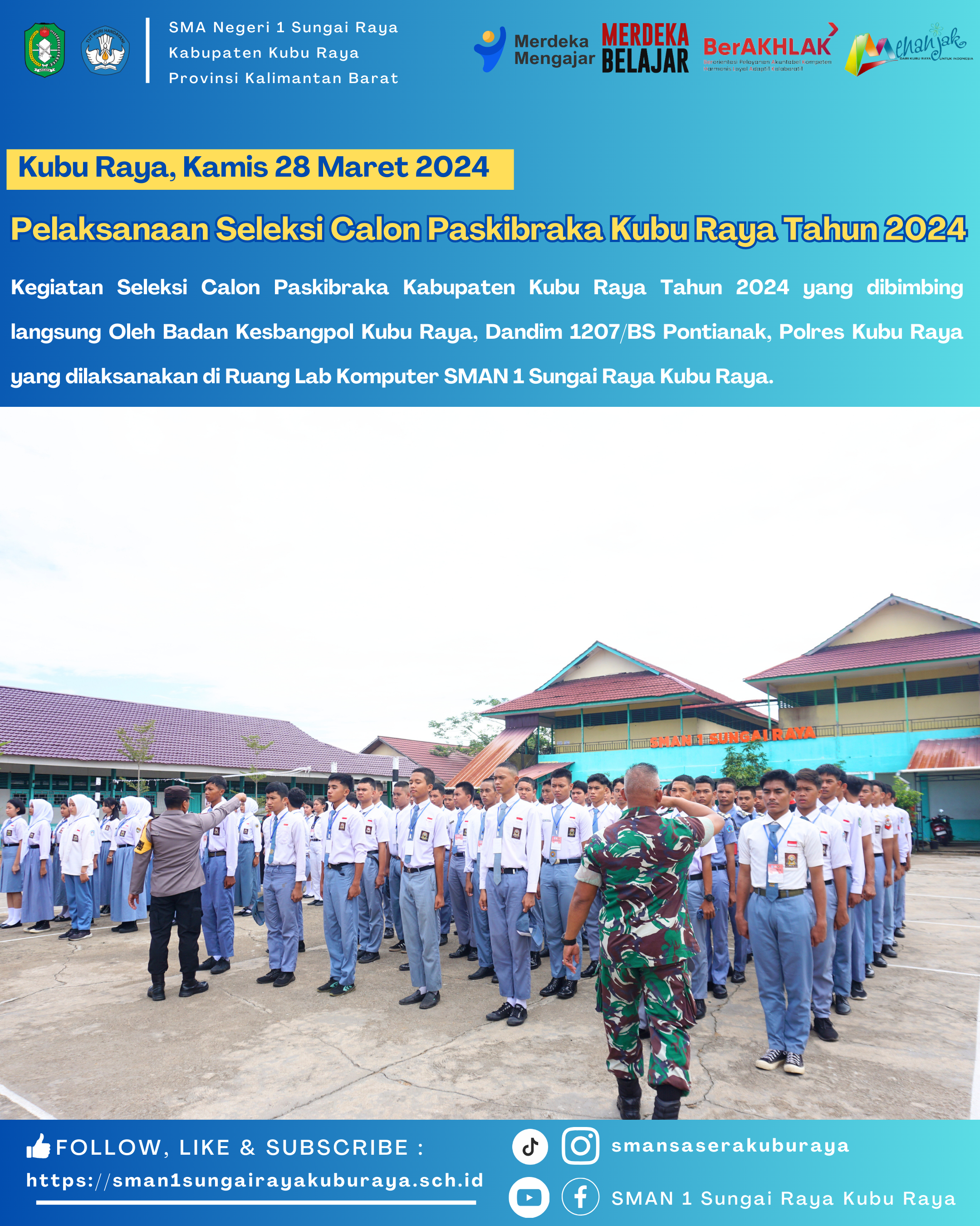 Kubu Raya, Kamis 28 Maret 2024 Berkenaan dengan Pelaksanaan Seleksi Calon Pasukan Pengibar Bendera Pusaka (PASKIBRAKA) yang dibimbing oleh Badan Kesa...