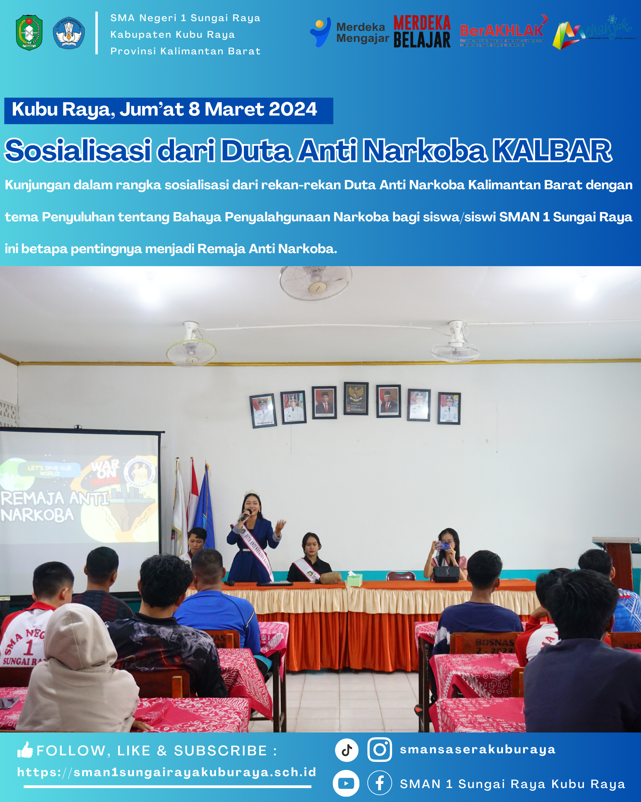 Sosialisasi dari Rekan-rekan Duta Anti Narkoba Kalimantan Barat bagi para siswa/siswi kelas XI MIA dan IIS SMAN 1 Sungai Raya dibimbing langsung oleh ...