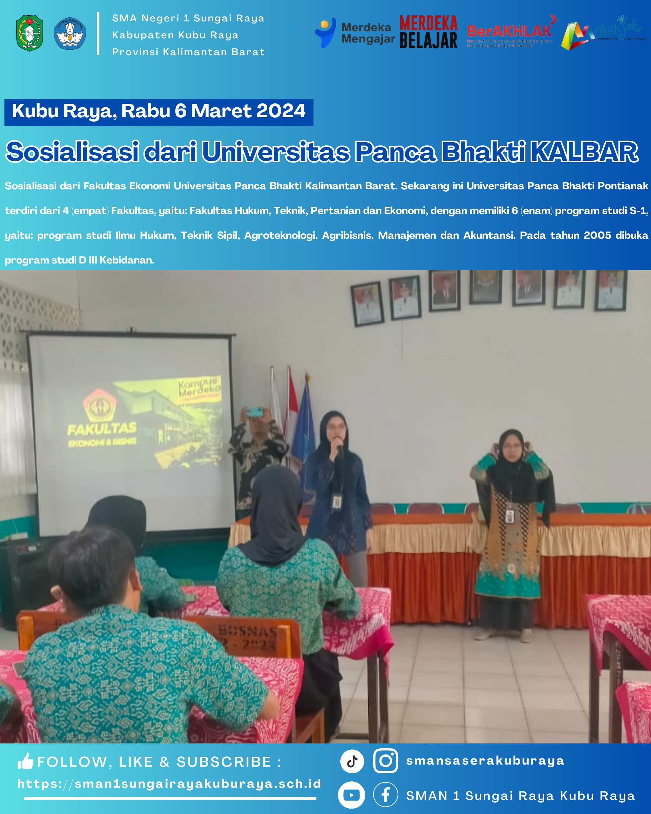 Sosialisasi dari Fakultas Ekonomi Universitas Panca Bhakti Kalimantan Barat bagi para siswa/siswi kelas XI MIA dan IIS SMAN 1 Sungai Raya dibimbing la...
