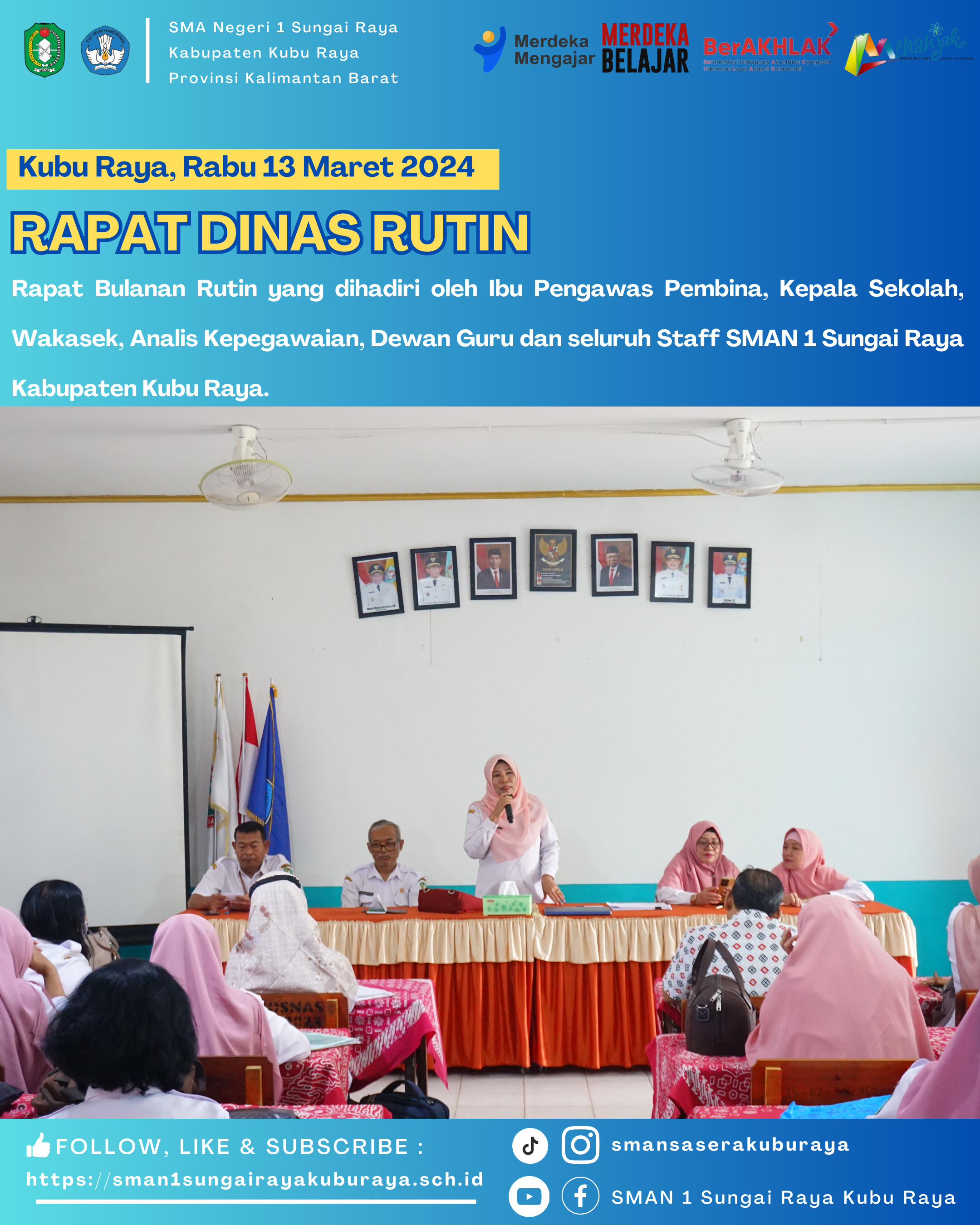Kubu Raya, Rabu 13 Maret 2024 Kegiatan Rapat Dinas Rutin ini dilaksanakan pada hari Rabu, 13 Maret 2024 Pukul 09.00 - selesai yang dipimpin oleh Kepa...