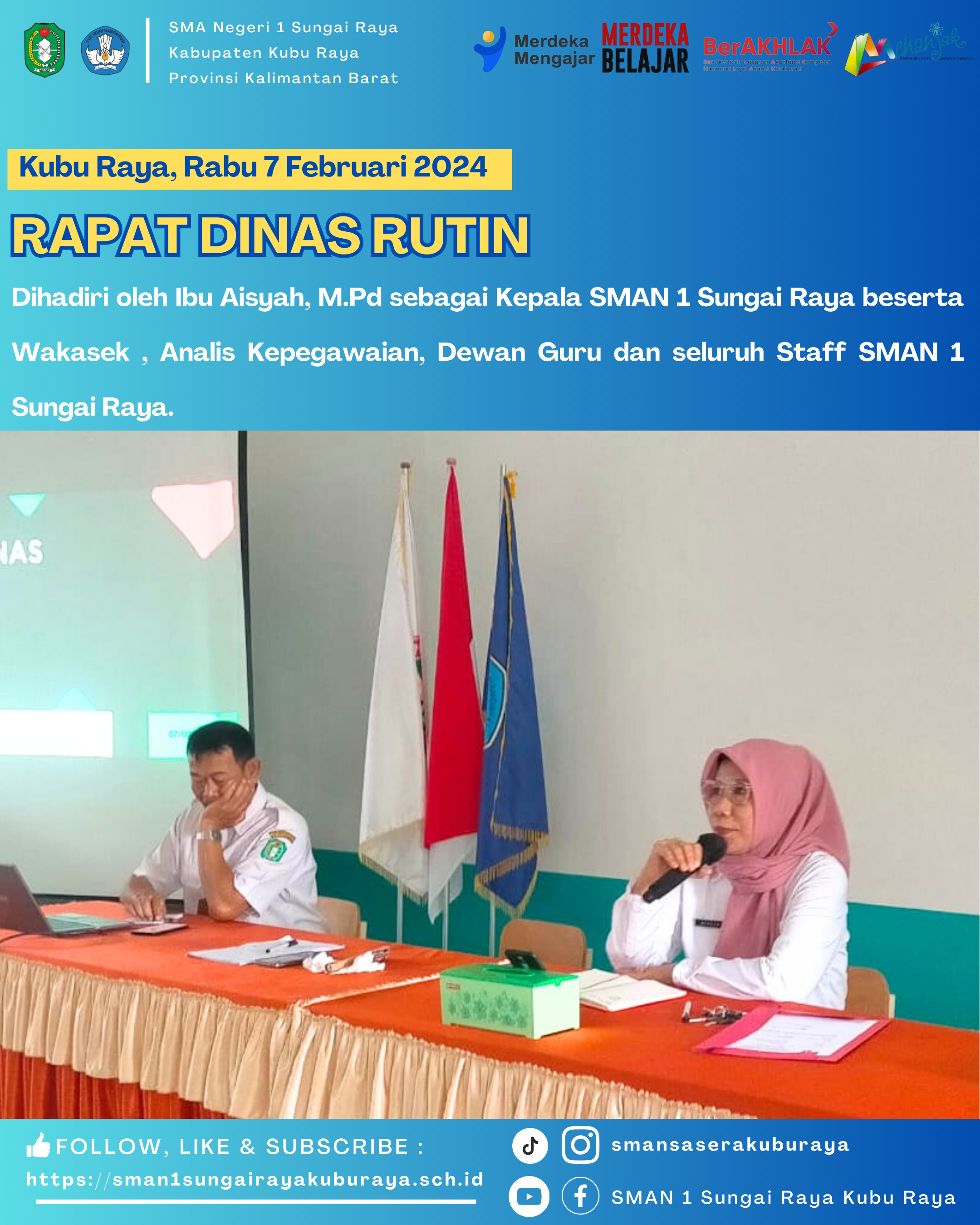 Kubu Raya, Rabu 7 Februari 2024 Kegiatan Rapat Dinas Rutin ini dilaksanakan pada hari Rabu, 7 Februari 2024 Pukul 10.20 - selesai yang dipimpin oleh ...