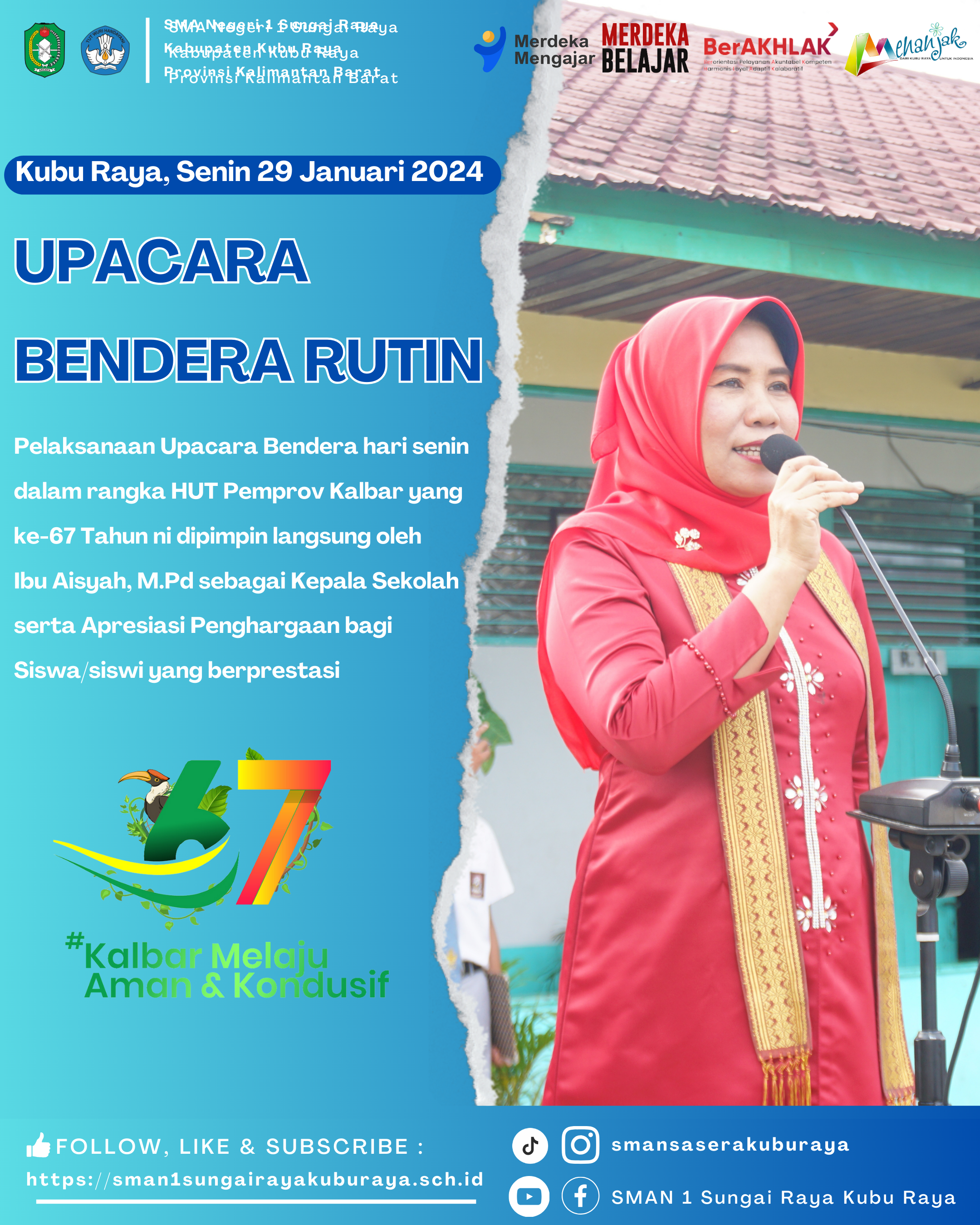 Kubu Raya, Senin 29 Januari 2024 Upacara Bendera Hari Senin ini dalam Rangka Peringatan Hari Ulang Tahun (HUT) Ke-67 Pemerintah Provinsi Kalimantan B...