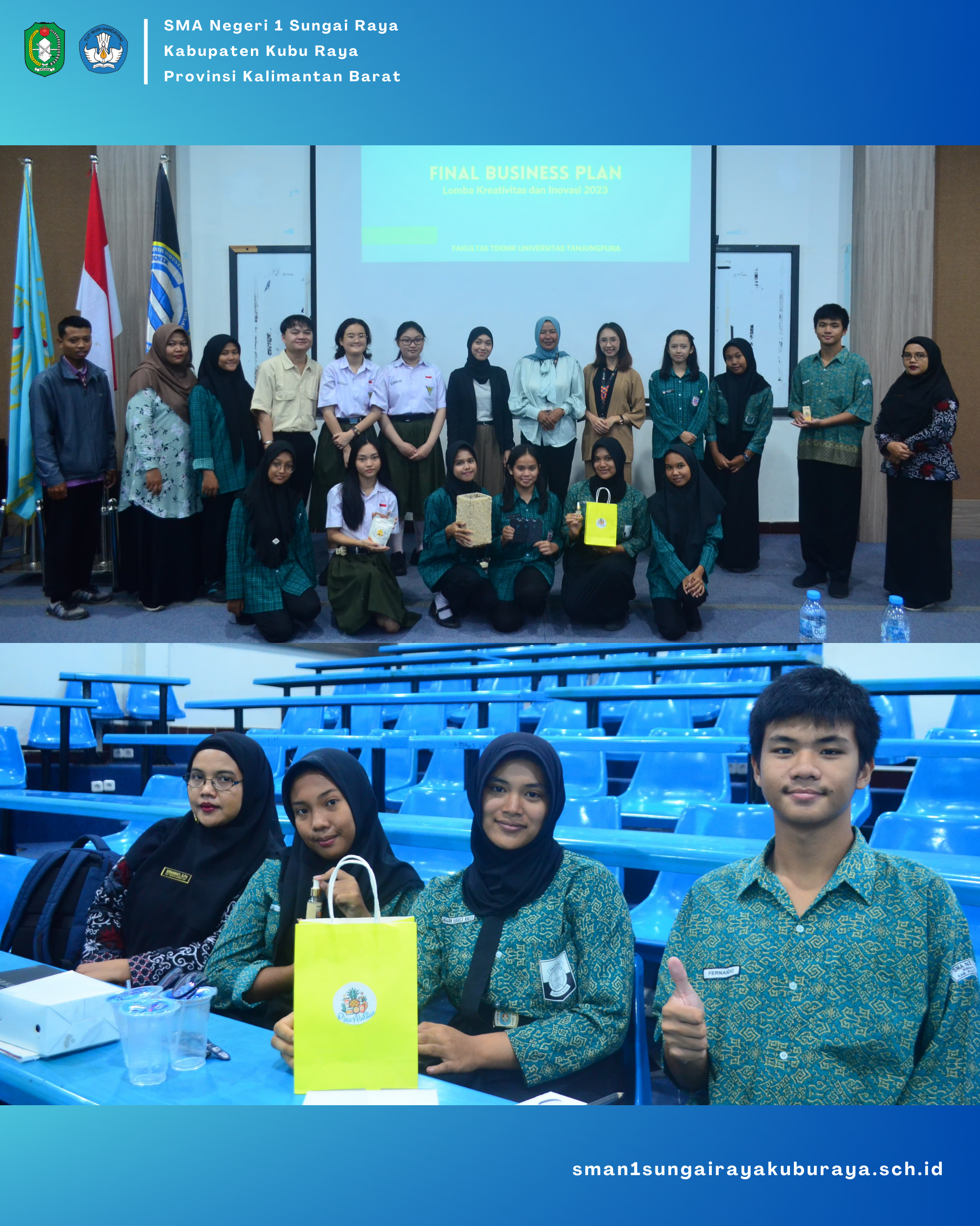 Salah satu siswa/siswi terbaik SMA Negeri 1 Sungai Raya yang telah membawa pulang Juara 2 Tingkat Provinsi pada Kejuaraan Lomba Kreasi dan Inovasi dengan kategori Lomba Business Plan pada Tanggal 15 Desember 2023 di Aula Fakultas Teknik Universitas Tanjungpura. Kegiatan ini dilaksanakan oleh Fakultas Teknik, Teknis Industri Universitas Tanjungpura yang berjumlah 12 Tim. Terimakasih sudah membawa harum nama Smansasera, semoga dapat menjadi contoh yang baik bagi siswa/siswi SMA Negeri 1 Sungai Raya Kubu Raya dalam meraih prestasi setinggi mungkin dan tetap rendah hati.