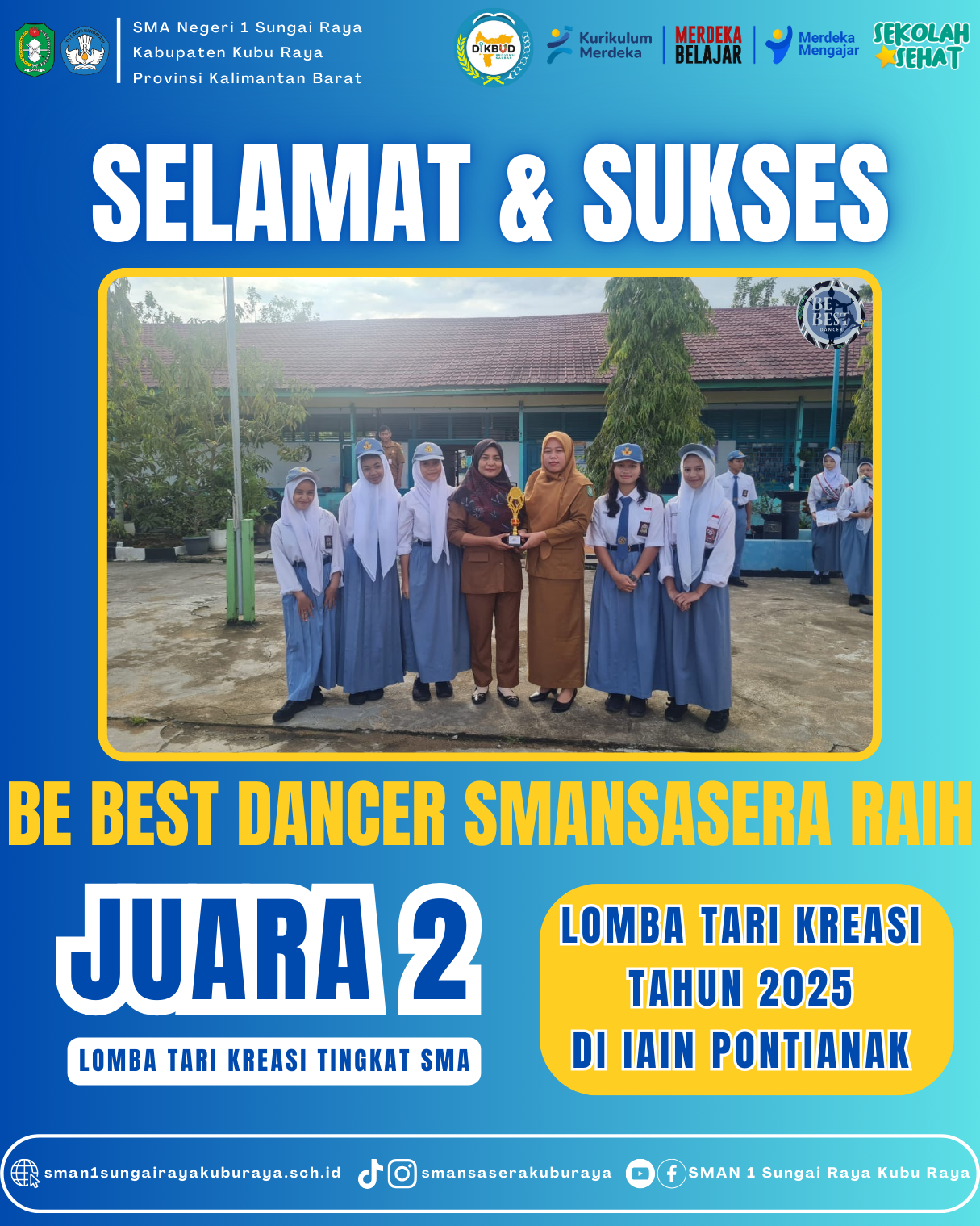 CONGRATULATIONS GIRLS !!! Selamat Kepada TIM Be Best Dancer SMA Negeri 1 Sungai Raya @bebestdancer yang telah membawa pulang Juara 2 Lomba Tari Kreasi Tingkat SMA yang diselenggarakan oleh IAIN Pontianak, Kalimantan Barat Tahun 2025. Terimakasih sudah membawa harum nama Smansasera, semoga dapat menjadi contoh yang baik bagi siswa/siswi SMA Negeri 1 Sungai Raya Kubu Raya dalam meraih prestasi setinggi mungkin dan tetap rendah hati.